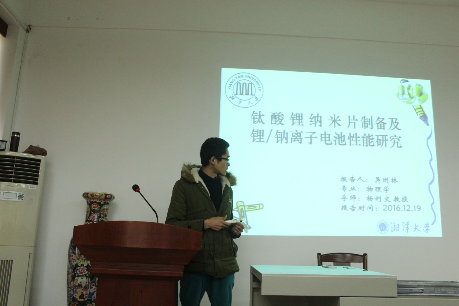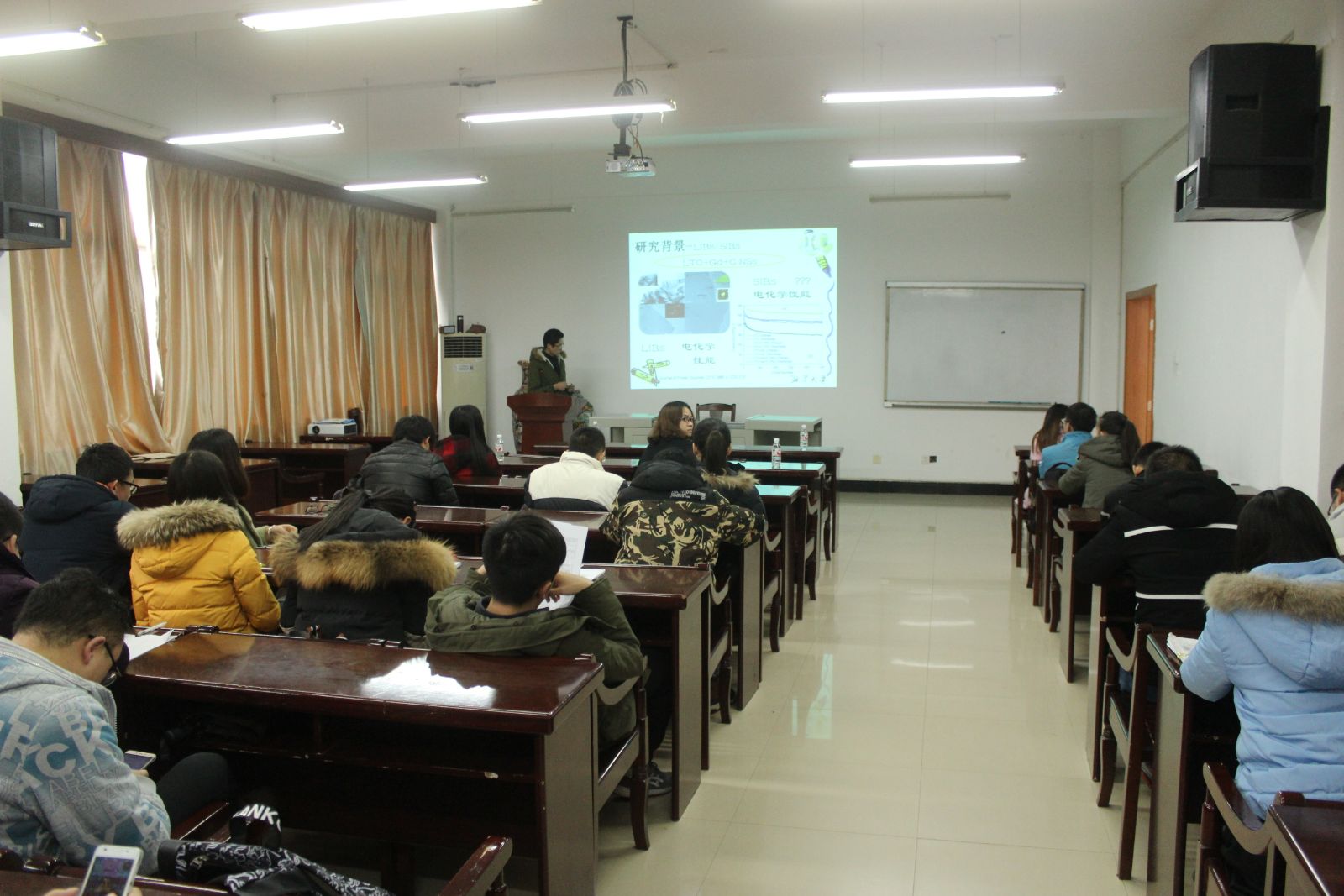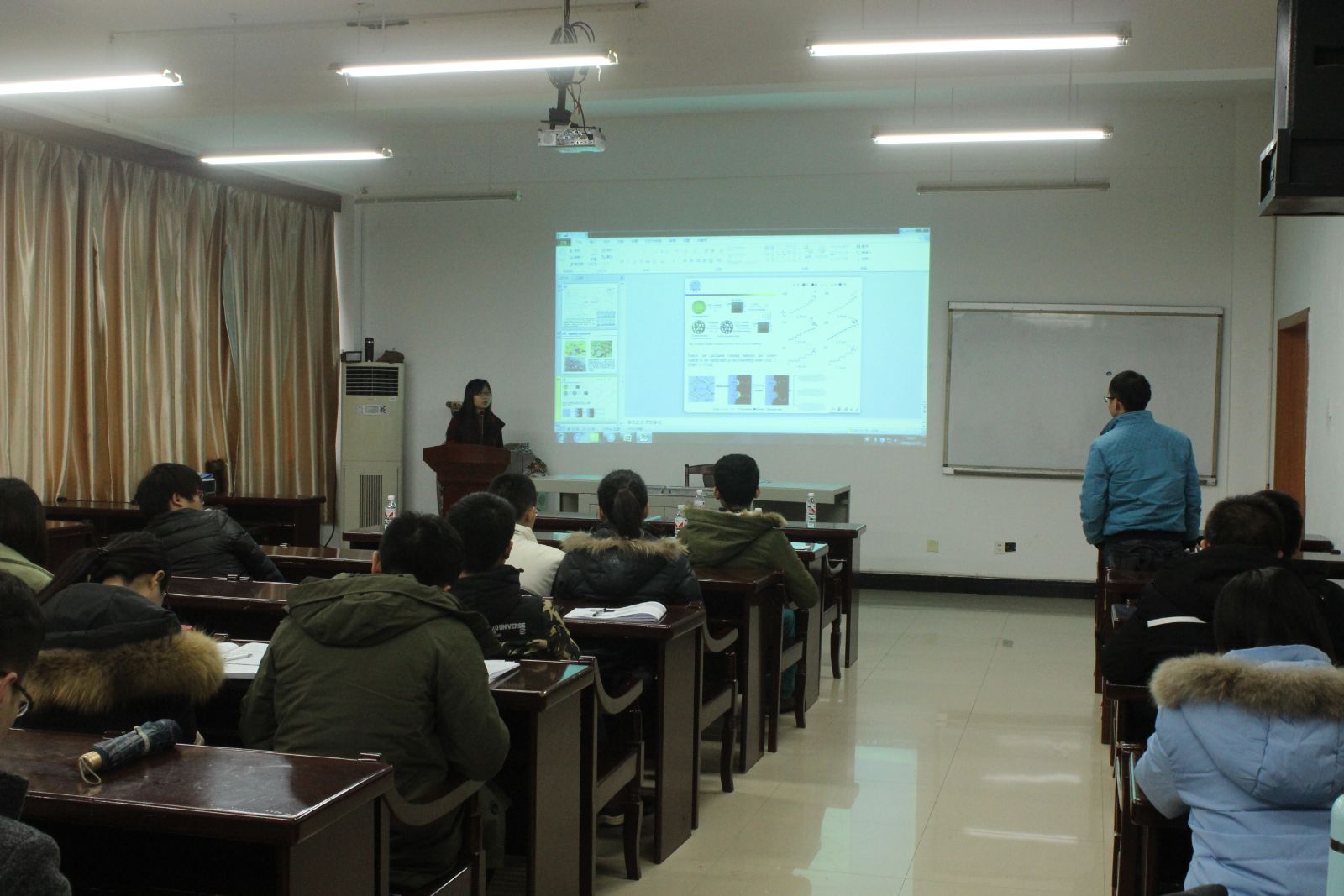 吴则林就题为“表面修饰层次多孔碳用于限制锂硫电池中的多硫化物的扩散”进行详细讲解。主要从研究背景、工作进展、工作计划、工作体会几个方面进行了报告,提出了对于文献要多读,多总结;实验要多做、多观察的宝贵意见。陈曼芳就题为“功能钌配合物与三螺旋核酸的作用机制”进行讲解。介绍了所在课题组的特色研究方向,自己研究课题的背景,工作进展和总结。李佳就题为“功能钌配合物与三螺旋核酸的作用机制”进行讲解,主要讲了功能钌配合物的合成与拆分,以及三螺旋结构核酸作用机制,并且根据自身的经验,在查阅文献、设计实验和论文写作的方面为大家提供了宝贵的意见。(照片由刘洋坪提供)