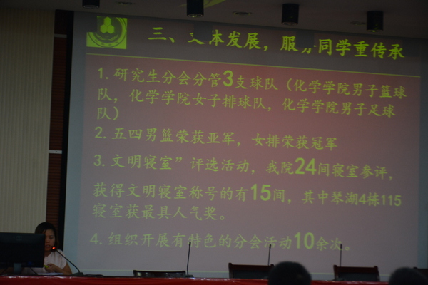 此次述职是评选优秀研究生分会中的一个环节,校研究生会的干部对述职情况做出计分评价。评选由综合考评、总会活动考评和分会活动考评三部分组成,将评出优秀学院研究生分会6个。