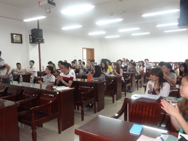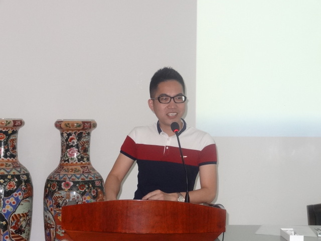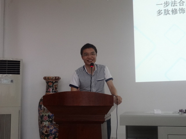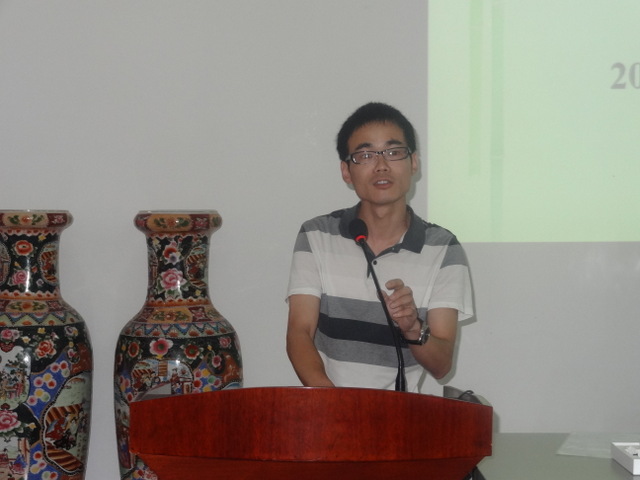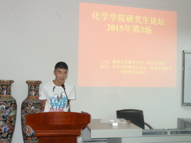 刘稳丰在论坛开始前的讲话中,对研究生此类活动给予高度评价,并希望在今后有更多的研究生上台讲座、将讲座讲好。论坛邀请了黄渊帅、王华敏、邓勇三位研究生分别就《浅谈研究生阶段的理性成长》 、《苯并二嗪类衍生物合成的新方法研究》 、 《一步合成水溶性分子刷型聚多肽修饰的单壁碳纳米管》开展了约两个小时的动情讲座。黄渊帅作为准博士生给我们分享了其三年学习经验,认真科研、不惧失败、富有创新、合理安排生活。王华敏首先就铁催化的二芳基喹唑啉酮的合成研究、钯催化的2-芳基喹唑啉的合成反应研究、钯催化的2-芳基酞嗪酮的合成方法研究做简单的介绍,最后用一张张图片生动展示了我们的日常生活,总结其学术研究历程:远视而务实,靠汗水赢得掌声而不是靠泪水赢得同情。邓勇简要介绍了所研究领域及其所获的一些成果,细致的演讲让师弟师妹们增强了科研信心和兴趣。讲座后,同学们意犹未尽,争先恐后与他们交流。(照片由徐超提供)