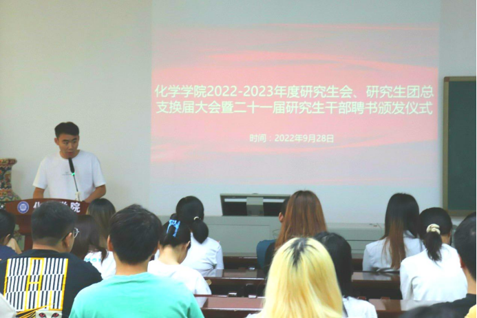 2022年9月28日中午12点,伟德BETVLCTOR2022-2023年度研究生会、研究生团总支换届大会暨二十一届研究生干部聘书颁发仪式在化学化工大楼A417举行。此次大会由二十二届研究生会主席姬建华主持,伟德BETVLCTOR李涛书记、袁雪萍老师及第二十一届、二十二届研究生干部参加。