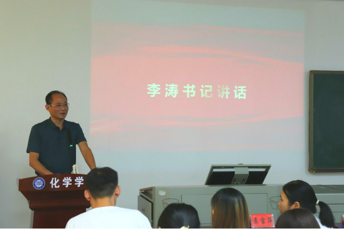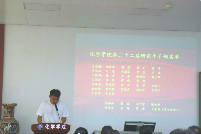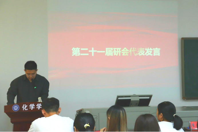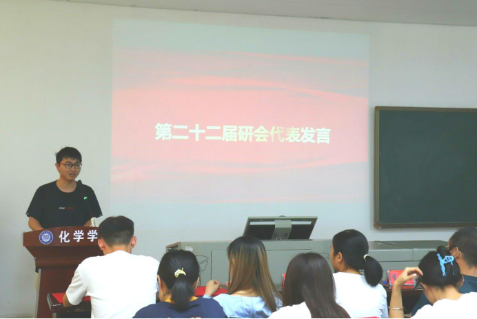 会议第二项,第二十一届研会主席解启盟发言,他首先对过去一年的研会工作进行了简要的总结,并代表二十一届研会对书记及各位老师的教诲与帮助、研会成员的相互包容与理解表示感谢,同时,也祝贺二十二届研会成员,希望大家能够享受在研会工作的快乐。最后寄语研会成员继续秉承服务同学,宣扬化学院的主旨做好研会工作。