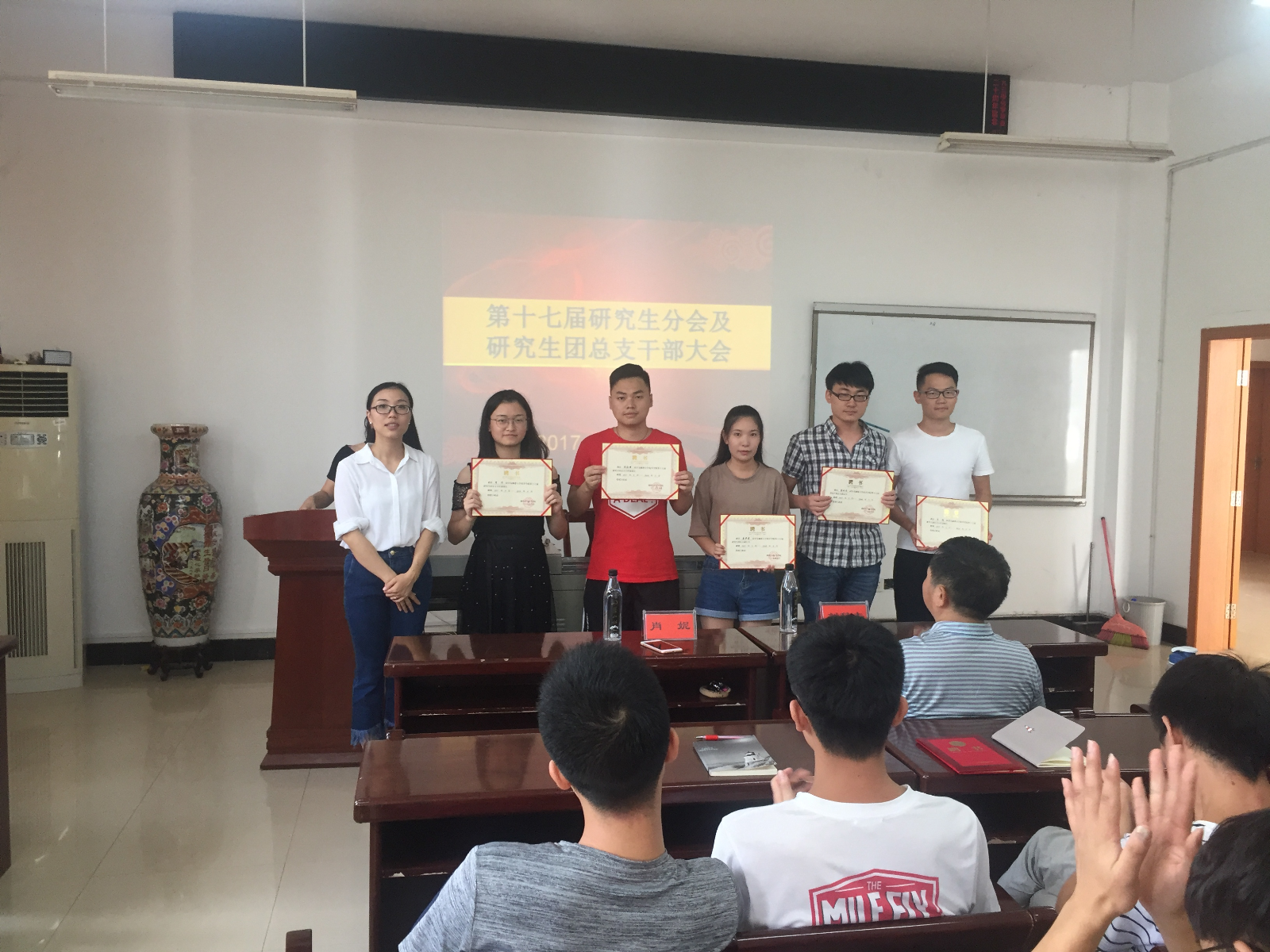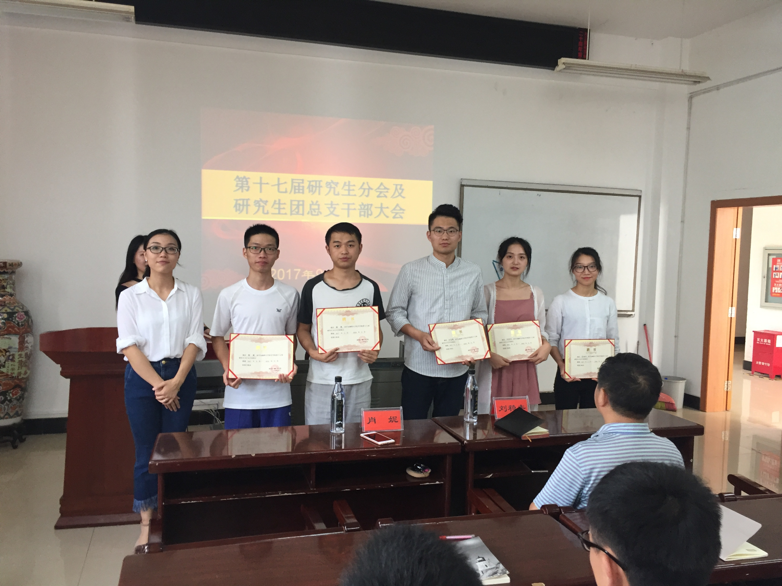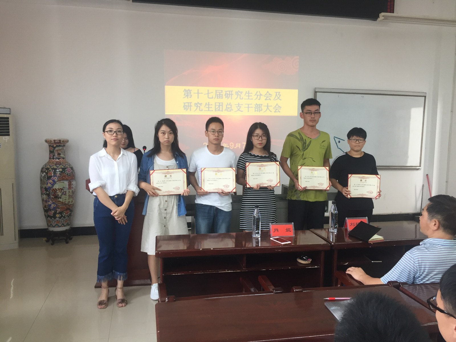 9月4日晚上,17届研究生在图书馆报告厅举行干部竞聘大会。9月7日中午,新一届研究生干部在化学化工楼A417参加受聘仪式,院党委副书记为研究生干部颁发聘书,并对研究生干部进行培训。