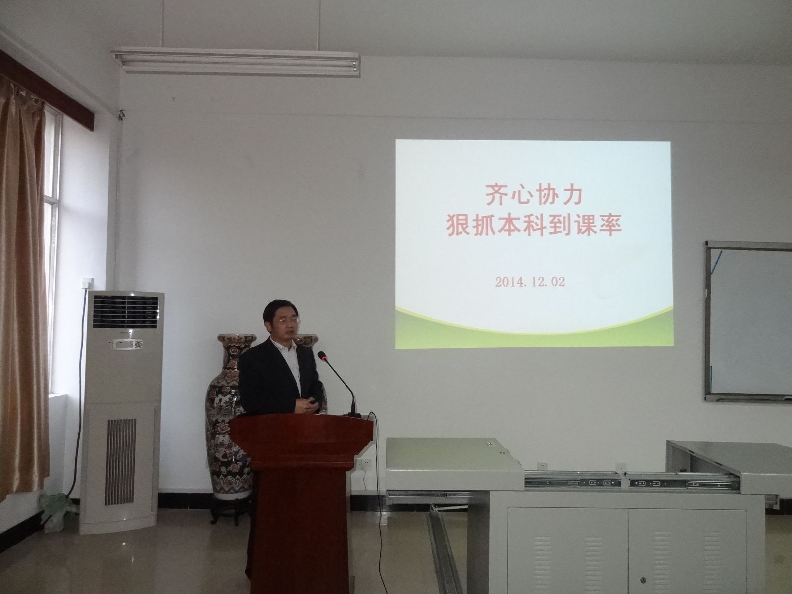 12月2日下午,在全院教职工大会上,院党委书记刘稳丰以“齐心协力,狠抓本科到课率”为题,用多媒体课件形式,传达了学校和学院有关会议精神。刘稳丰从课堂情况、原因分析、具体措施三个方面作具体解说。刘稳丰指出,到课率有所好转,但是还不令人满意,其原因有学生的原因,也有教师的原因,还有管理的问题。因此,一要高度重视,以抓到课率为切入点促进学风建设,到课率的提高不能仅某几个人的工作,到课率是全院目标可和的指标,也是评价教师教学水平高低的指标。 二要明确职责,院长书记要亲自过问,掌握整体情况,要进一步落实院系领导进课堂检查的制度,学工、教务工作人员要深入到课堂抓纪律,班主任要强调、督促、检查 ,教师再不能说“学生不来听课不是我的事”了。三要严格管理,要严格请、销假程序,请假条须经班主任签字同意和学院学工办签字盖章,要严格落实双考勤制度,教师上课时要对考勤情况严格把关或抽查,要严格考试制度,消除学生考试侥幸过关心理,要加强教学改革,提高教学质量,增强课堂对学生的吸引力,要对课堂效果较差的课堂,要及时查课、调研,采取措施整改;要进一步加强和改进大学生思想政治工作,正确引导学生。
