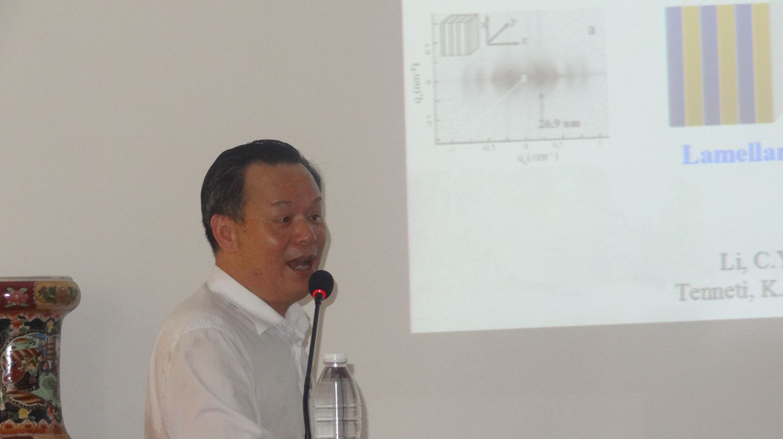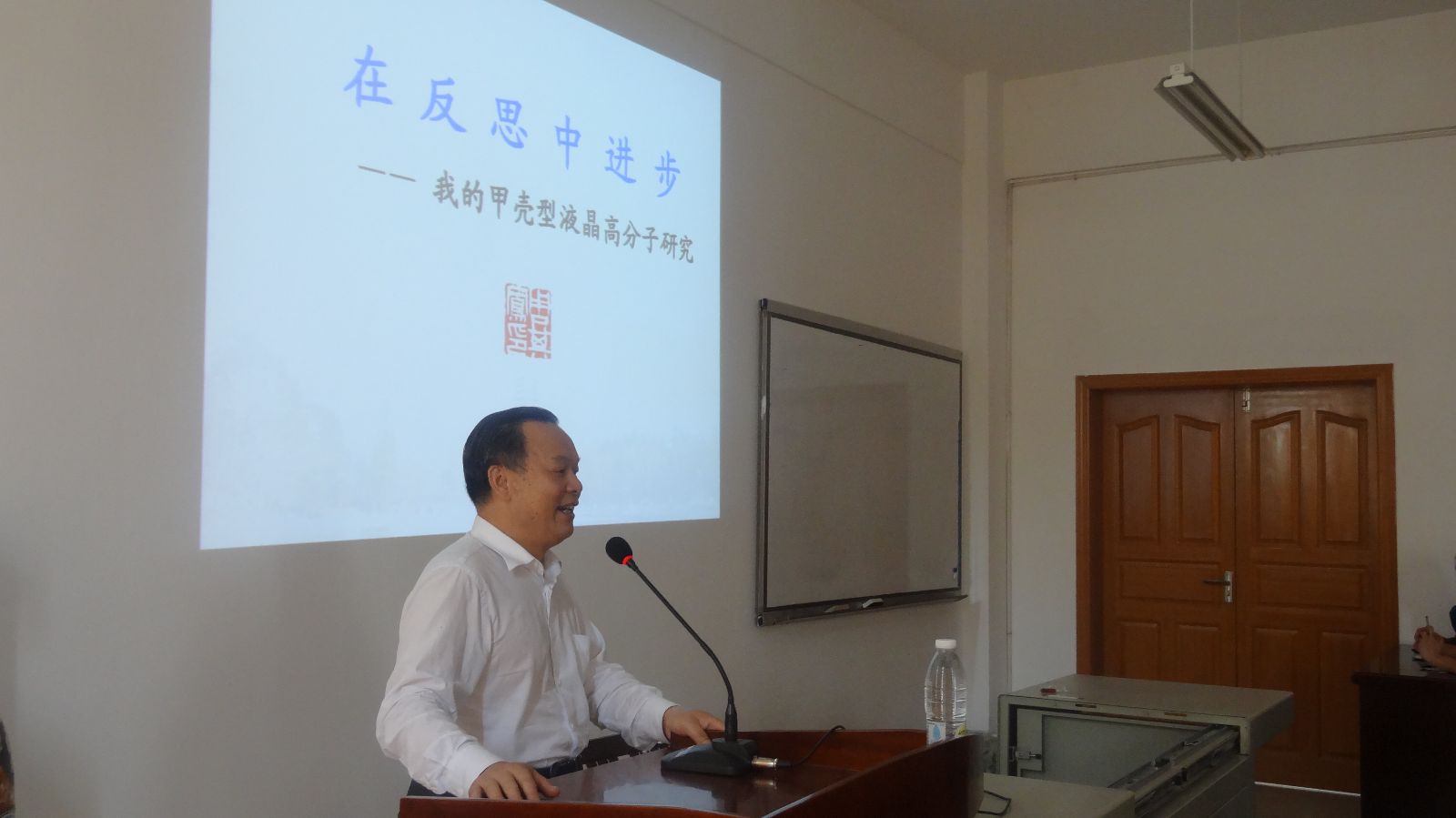 周院士从物质的形态出发,生动形象的为大家解释液晶态在显示方面的应用、原理及其重要性,指出将液晶分子与高分子进行结合具有十分重要的意义。周院士以侧链型液晶高分子为主,为在座的老师和同学讲述了一个具有传奇色彩和科学意义的动人故事:在Finkelmann, H率先提出“柔性间隔段去耦合”的理论后,周院士进行了总结与反思,从而提出了“液晶基元通过其重心或接近重心的位置与主链连接以减小主链热运动对侧基的作用”的解决方案,并就此方案设计出第一个“腰接型”高分子,甲壳型液晶高分子概念最终引起了相关领域学者的广泛关注,也向全世界展示了中国科学家在科研方面的突出能力和重大成就,被学术界认为是一件十分有意义的工作。