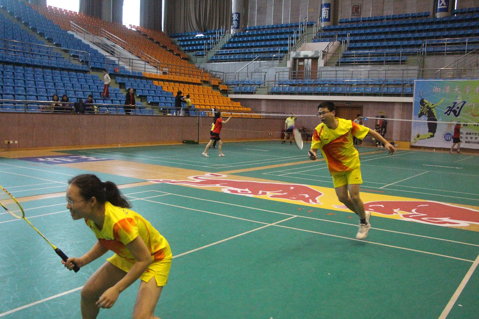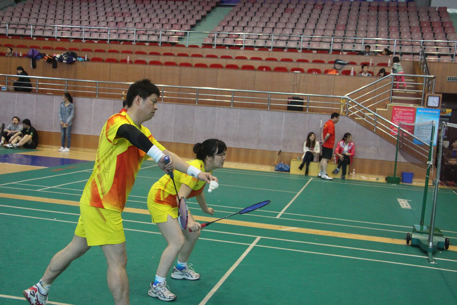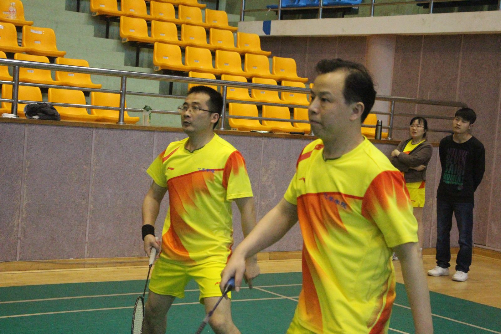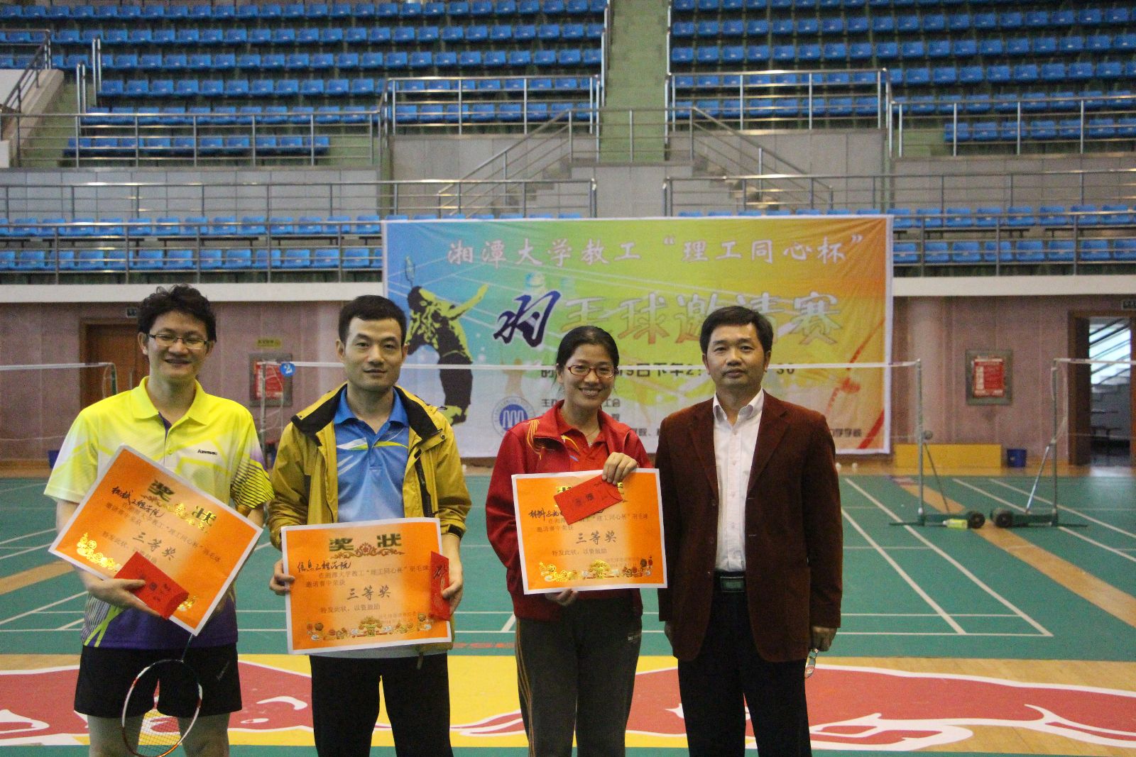 本次比赛项目设两对男双、两对混双,其中一对混双必须是由一名院领导和该学院另一异性教师组成。每场比赛采取三局两胜制,率先得到15分的一方赢得当局比赛。有院领导参加的那对混双单循环赛之后确定名次,其他三对双打循环赛之后按得分取团体名次,得分相同按小分计算。团体赛和院领导个人比赛均设一等奖一名、二等奖一名,其余为三等奖。