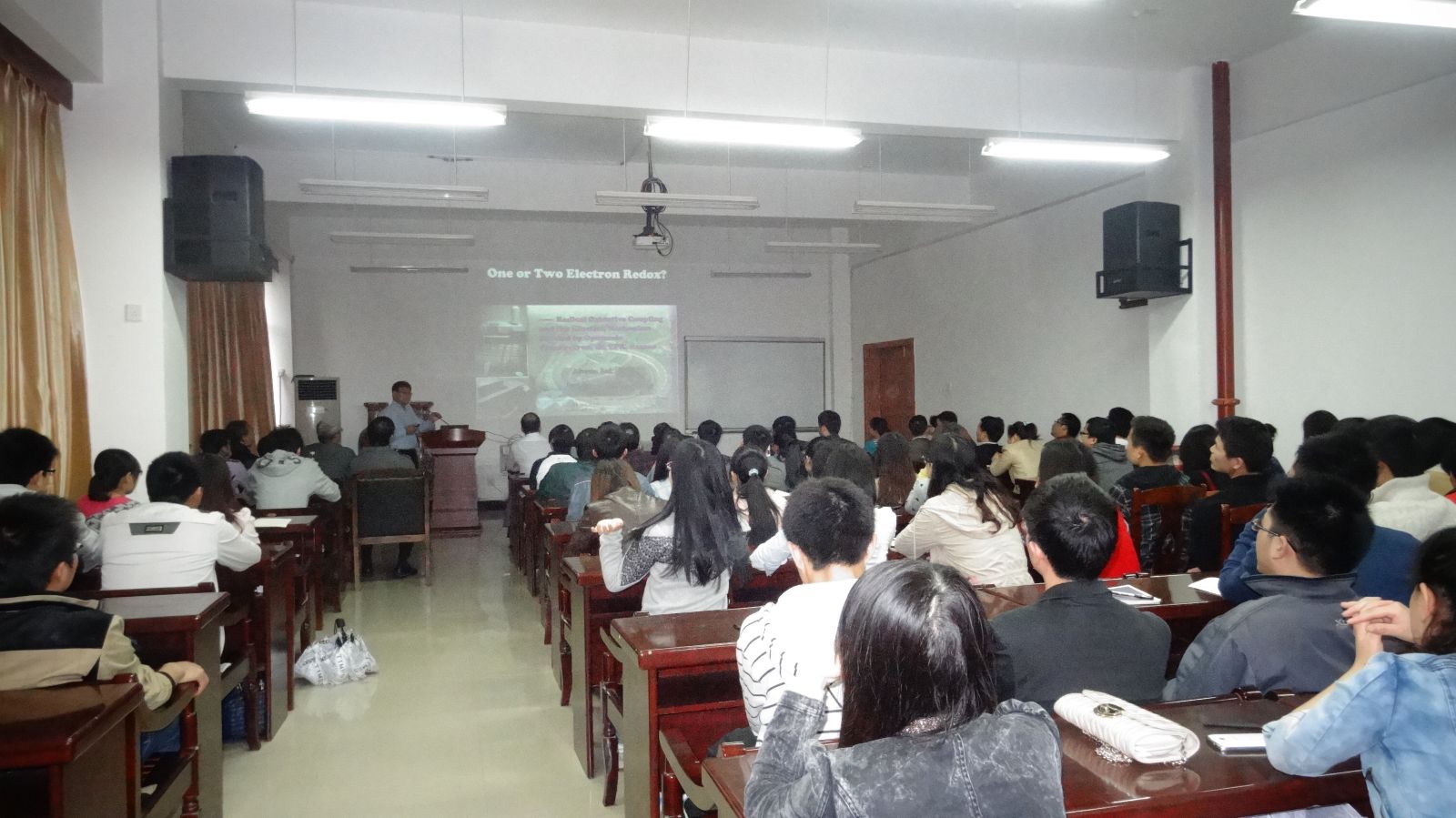 开幕式结束后,武汉大学雷爱文教授以“One or Two Electron Redox:Radical Oxdative Coupling and Mechanism Revealed by Operando XAS,IR,Raman,and EPR etc”为题作学术文化节首场学术报告。