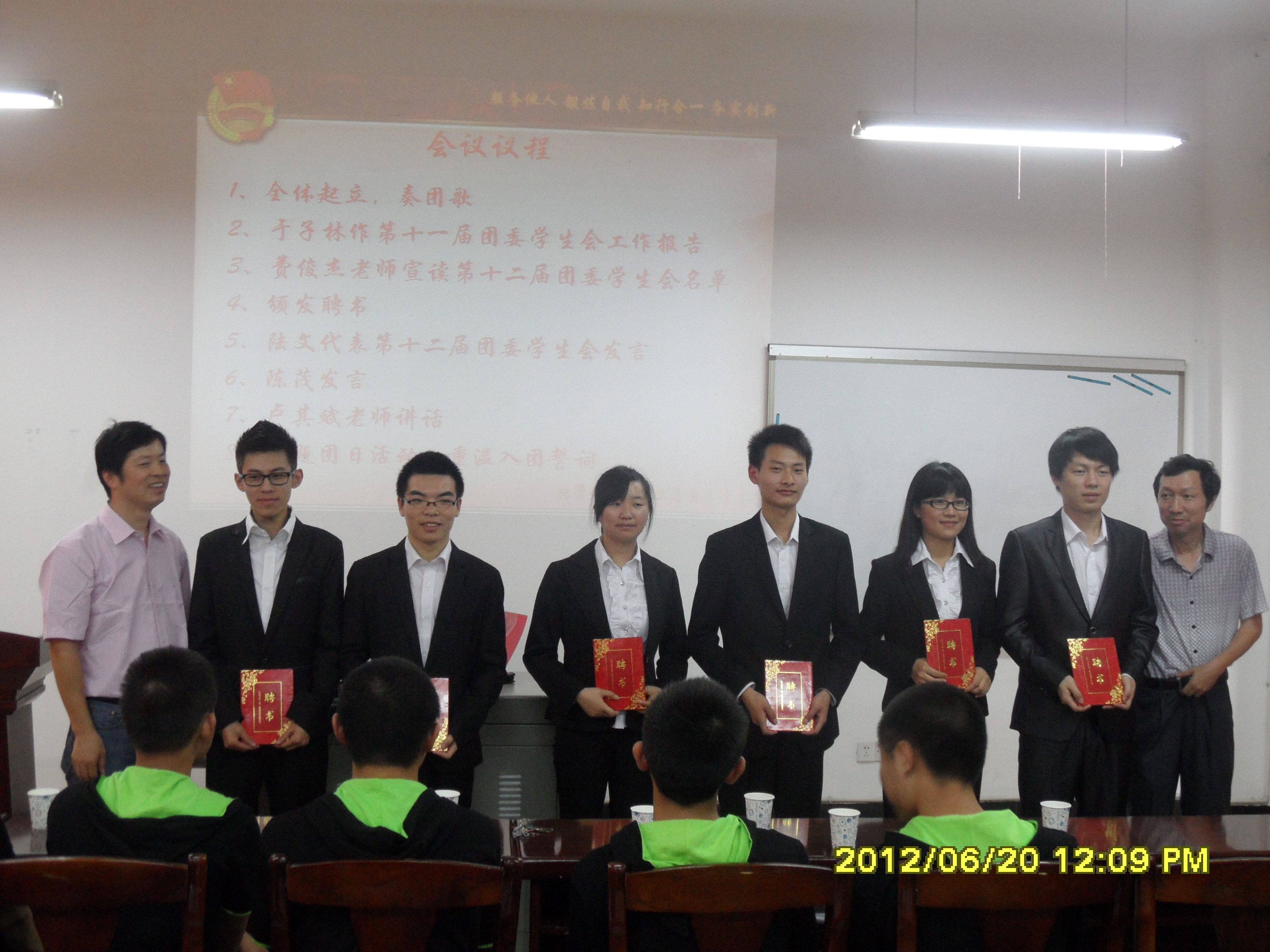 本次大会,先由于子林学姐总结了一年来第十一届团委学生会的点滴工作及取得的成绩。再由上届主席团成员给新一届的主席团成员及干部成员颁发聘书。之后卢其斌老师上台发言,希望新一届的团委学生会干部们能以身作则,带领好即将到来的新生,再创佳绩。