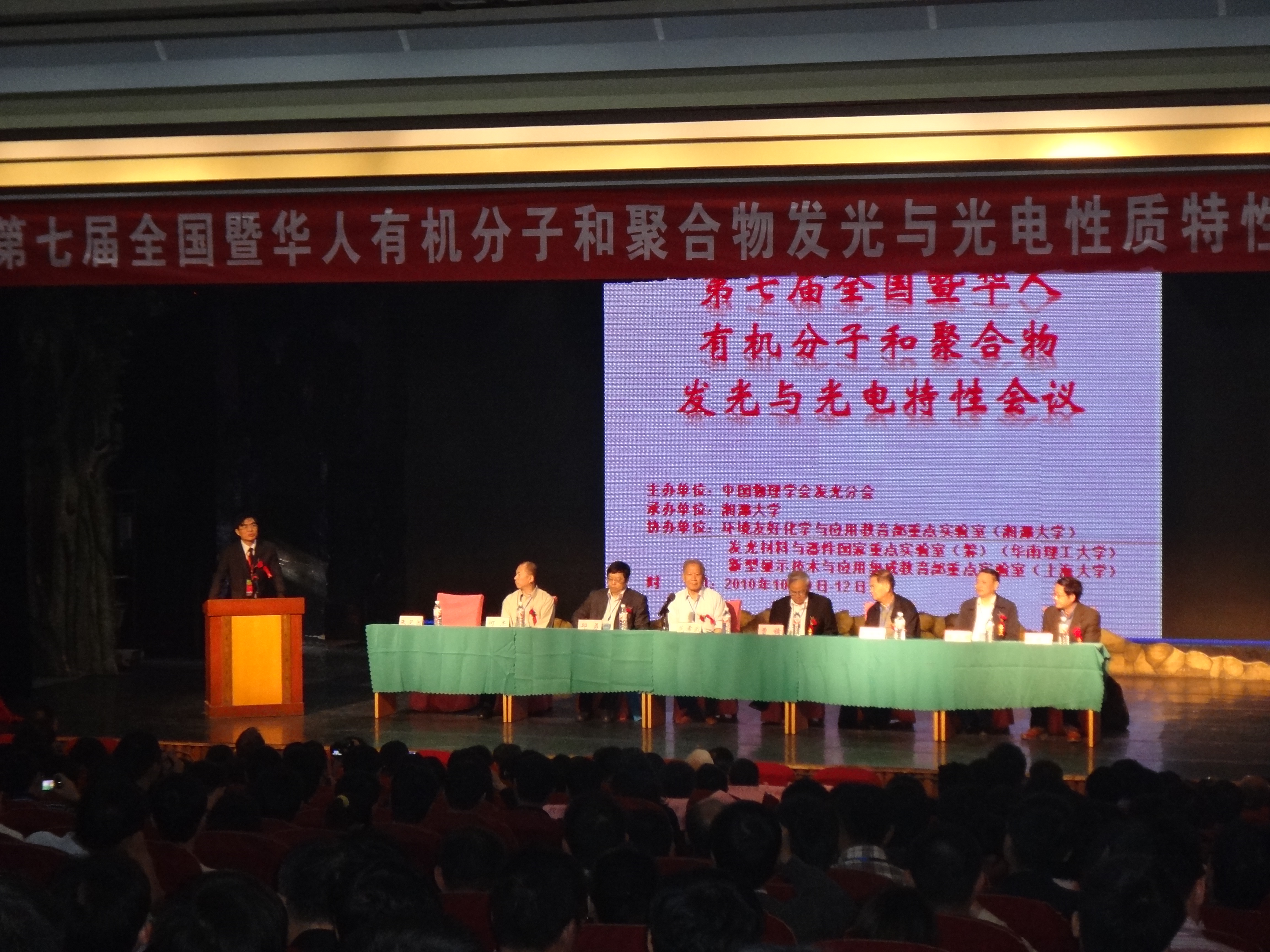 210月9日至12日,由中国物理学会发光分会主办,伟德BETVLCTOR承办,华南理工大学发光材料与器件国家重点实验室(筹)、上海大学新型显示技术及应用集成教育部重点实验室、伟德BETVLCTOR环境友好化学与应用教育部重点实验室协办的第七届全国暨华人有机分子和聚合物发光与光电特性学术会议在风景秀丽的湖南省张家界市隆重召开,来自国内外(包括港澳台)70余所学校、研究机构及企业的代表共489人参加了本次大会。中国物理学会发光分会主席范希武教授、华南理工大学曹镛院士、北京大学秦国刚院士、清华大学副校长邱勇教授、伟德BETVLCTOR正校级督导陈小明教授、国家自然科学基金委信息部何杰处长、中国物理学会湖南分会主席、伟德BETVLCTOR光电材料与物理学院院长钟建新教授,应邀出席了大会。