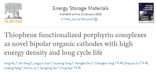 论文题目:Thiophene functionalized porphyrin complexes as novel bipolar organic cathodes with high energy density and long cycle life.