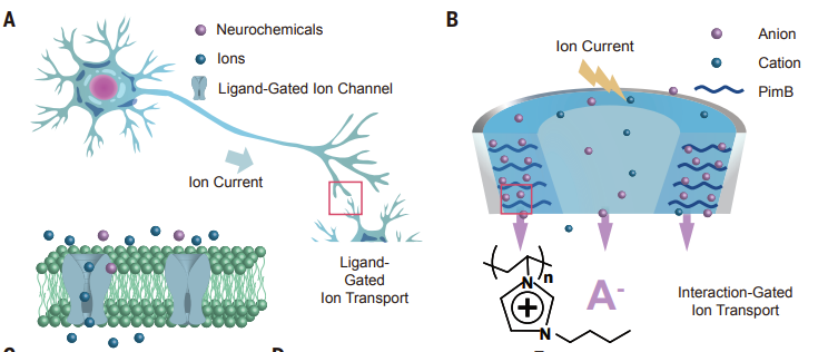 神经元(A)和纳流体忆阻器(B)示意图