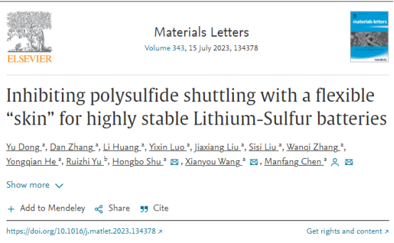 4月13日, 2020级化学类韶峰班本科生董宇以独立第一作者在SCI期刊《材料快报》(Materials Letters,影响因子IF: 3.574)发表论文《柔性“皮服”抑制多硫化物穿梭打造高稳定性锂硫电池》(Inhibiting polysulfide shuttling with a flexible “skin” for highly stable Lithium-Sulfur batterie)。研究成果从分子尺度设计新能源材料与器件,致力于新能源汽车的高比能锂硫电池研究和推广应用。伟德BETVLCTOR陈曼芳副教授,舒洪波教授和王先友教授为通讯作者,我校为第一通讯单位。董宇同学积极参与科研与校园实践活动,主持省级大创项目1项、获评伟德BETVLCTOR2022年度“十佳学生干部”。