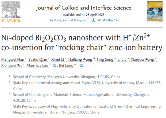 4月28日, 2020级化学专业本科生韩梦炜以独立第一作者在国际知名期刊《胶体与界面科学杂志》(Journal of Colloid and Interface Science,影响因子IF: 9.965)发表论文《具有H+/Zn2+共嵌入机理的镍掺杂碳酸氧铋纳米片应用于摇椅式锌离子电池》(Ni-doped Bi2O2CO3 nanosheet with H+/Zn2+ co-insertion for “rocking chair” zinc-ion battery)。伟德BETVLCTOR龙碑副教授和澳门大学Man-Kay Law副教授为通讯作者,我校为第一通讯单位。韩梦炜同学大一进入王先友教授团队并跟随龙碑副教授开展新型储能材料研究,针对锌枝晶问题和开发先进负极的需求展开相关研究,水系锌离子电池被认为是下一代最具潜力的大型储能体系之一,受到广泛的关注。