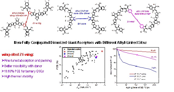 该研究开发了三种高效稳定的非完全共轭巨分子受体,其中,基于D18/BS3TSe-4F:2Y-wing的三元OSCs实现了19.13%的PCE,这是基于巨分子受体构建的OSCs中的最高值。研究开发的用于构建巨分子受体的烷基连接位点工程为提高OSCs的PCE和稳定性提供了一种可行的方法。