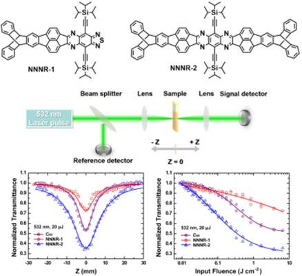 该研究将多重五元环和氮杂环植入线性并苯稠环骨架中,开发了一类可溶解、稳定以及目前报道最长的N-杂非交替纳米带分子。首次将其应用于非线性光学领域中,展现出了优异的反饱和吸收非线性光学性能。在相同测试条件下,NNNR-2的三阶非线性吸收系数达374cm GW–1,显著高于经典非线性光学材料C60(153 cm GW–1)。该研究工作拓展了有机三阶非线性光学材料的分子体系,为创造更多的高性能碳纳米带非线性光学材料提供了新的研究思路。