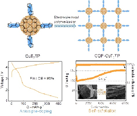 文章认为,通过分子结构调控手段,在卟啉结构的间位引入具有高电子导电性的噻吩结构单元,运用电化学聚合物策略,设计合成了一种新型共轭有机聚合物(COPs)COP500-CuT2TP(poly [5,10,15,20-tetra(2,2′-bithiophen-5-yl) porphyrinato] copper (II)),由于该分子在电场和离子协同作用下具有自剥离行为,COP500-CuT2TP正极在100 mA/g的电流密度下表现了极高的放电可逆比容量(420 mAh/g)和比能量密度(900 Wh/Kg)。即使在5 A/g的大电流密度下,也能在循环8000次后而无明显的容量损失。这一研究成果为开发兼顾高容量、长循环稳定的有机正极提供了新的策略。