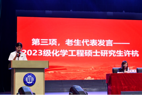 2023级化学工程班硕士研究生许杭作为老生代表发言。她结合自身在学院的学习与科研经历,从“如何快速适应学习节奏”、“如何正视挫折,以积极的心态面对学习科研”、“如何交流合作,借助团队力量提升自我”三个方面,为新生分享实用经验。她鼓励学弟学妹们主动向老师和前辈请教,在科学探索中不惧失败与挑战,传承伟德BETVLCTOR“勤学笃实、求真创新”的优良学风,在专业领域稳步前行。