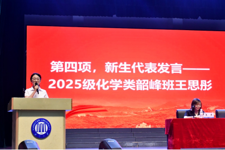 新生代表2025级化学类韶峰班王思彤代表全体2025级新生表达了对大学生活的期待与向往。她表示化学有韶峰班对科研创新的卓越追求,有化学专业深厚的基础教育,有能源化学对可持续发展的回应,有高分子材料与工程对科技前沿的聚焦,也有应用化学将理论付诸实践的使命担当。他们将以湘大为新的起点,以化学为共同的语言,潜心钻研、勇于探索,努力成长为既有扎实专业能力,又具备创新精神与社会责任感的新时代化学人。