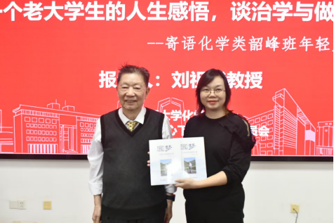 报告伊始刘祖武教授给学院赠送了他2025年出版的书《圆梦∣一个农村少年的成功之路》。88岁的刘老总结回顾自身数十年的求学、工作、治学与育人经历,向学生娓娓道来一个从农村出发的少年坚持梦想,追求梦想的历程。他深情回忆了过往的求学岁月,分享了在治学道路上的心得体会与人生智慧,着重讲述了树立理想信念、解决青年主要矛盾、提高政治觉悟、提升创新思维等问题。刘教授寄语在座的青年学生,不仅要扎实掌握专业知识,更要注重个人品格的修养,将“治学”与“做人”紧密结合,树立远大理想,未来运用所学专业本领服务社会、报效祖国。“刘老师的讲座内容深刻,情感真挚,也给我们提供了一次与学术前辈、人生导师面对面交流的宝贵机会,让我们受益匪浅。”23级化学类韶峰班李阳同学说道。