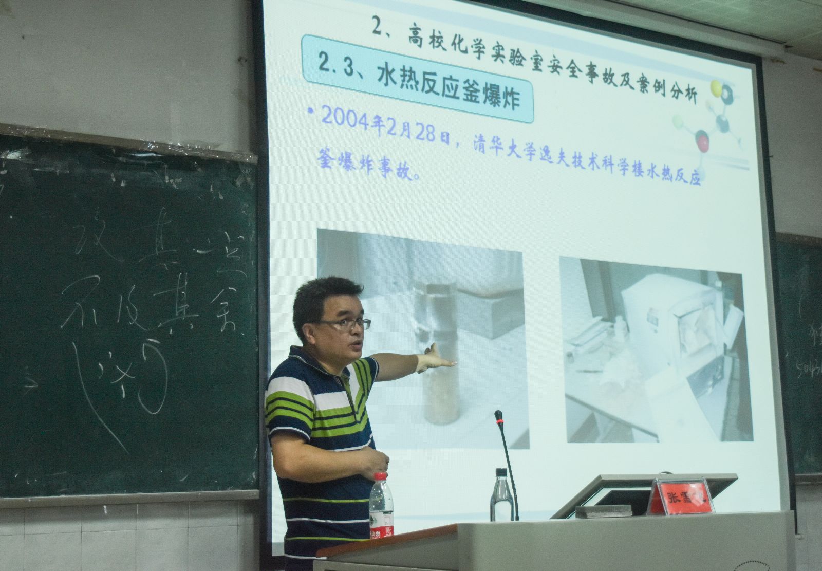 其次,他提到实验室常见问题,如化学品的安全使用及危险化学品分类,防止试剂意外泄露的处理以及实验室“水电火气”的安全。要求大家在实验过程中一定要遵守实验室安全准则,从小事做起、从细节做起,防患于未然。