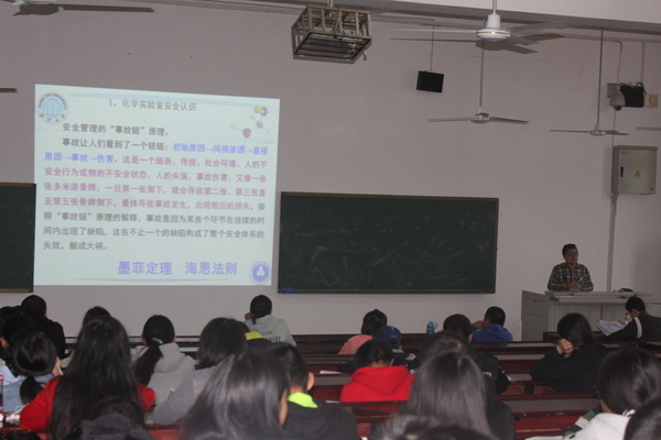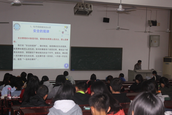 10月15日,化学院副院长张雪飞和实验室安全员胡海在逸夫楼为2017级本科生开展实验室安全知识讲座,讲座分两批次进行,高分子材料与工程3班等5个班上午在逸夫楼三阶进行学习,应用化学2班等5个班下午在逸夫楼二阶进行学习。