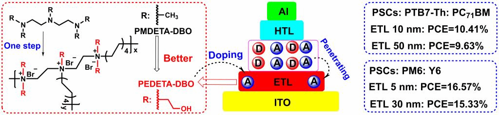 2021年9月,赵斌教授创新性地以五(羟乙基)二乙烯三胺作为原料,将其与二溴辛烷反应,获得了一类廉价的聚电解质,这类聚电解质可代替无机氧化物纳米材料及共轭聚合物作为厚度不敏感型电子传输层,用于制备高性能PSCs。其研究成果发表在《Journal of Materials Chemistry A》上,硕士研究生俞玉富为论文的第一作者,赵斌教授为第一通讯作者,谭松庭教授为共同通讯作者,伟德BETVLCTOR为第一通讯单位。(全文链接:https://pubs.rsc.org/en/Content/ArticleLanding/2021/TA/D1TA06416A)。