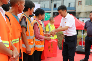 一切为了人民,一切依靠人民。下花桥镇政府理解社会弱势群体,并关心他们的身体健康和心理状态,借此活动,下花桥镇党委书记杨艳明同志、镇长杨英伟和下花桥商会会长刘友华同志为摩托车驾驶员发放了安全头盔,为环卫工人们发放防暑礼品,他们收到礼物都露出了开心的笑容。