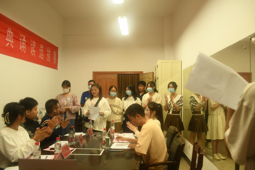 本次选拔赛参赛同学被分为A,B,C,D四组,参赛同学首先在签到处签到,之后在候场处准备着自己的朗诵。大赛伊始,主持人翟珂旭先是介绍评委嘉宾、比赛规则、评分标准。之后,选拔赛正式开始,A组选手依次上台朗诵,每名同学朗诵后,朱嗣杰、朱钊磊等评委老师都热情亲切地对参赛同学的诵读进行了客观的点评,最后打上分数。后稍作休息几分钟,评委们汇集了评分结果。
