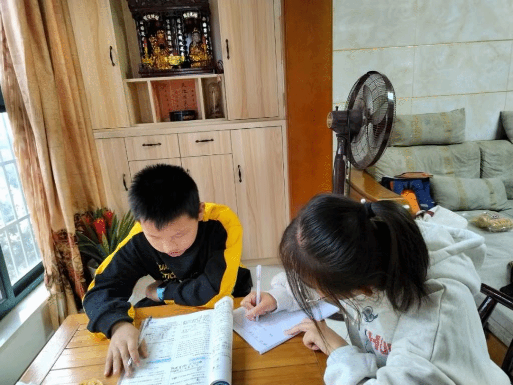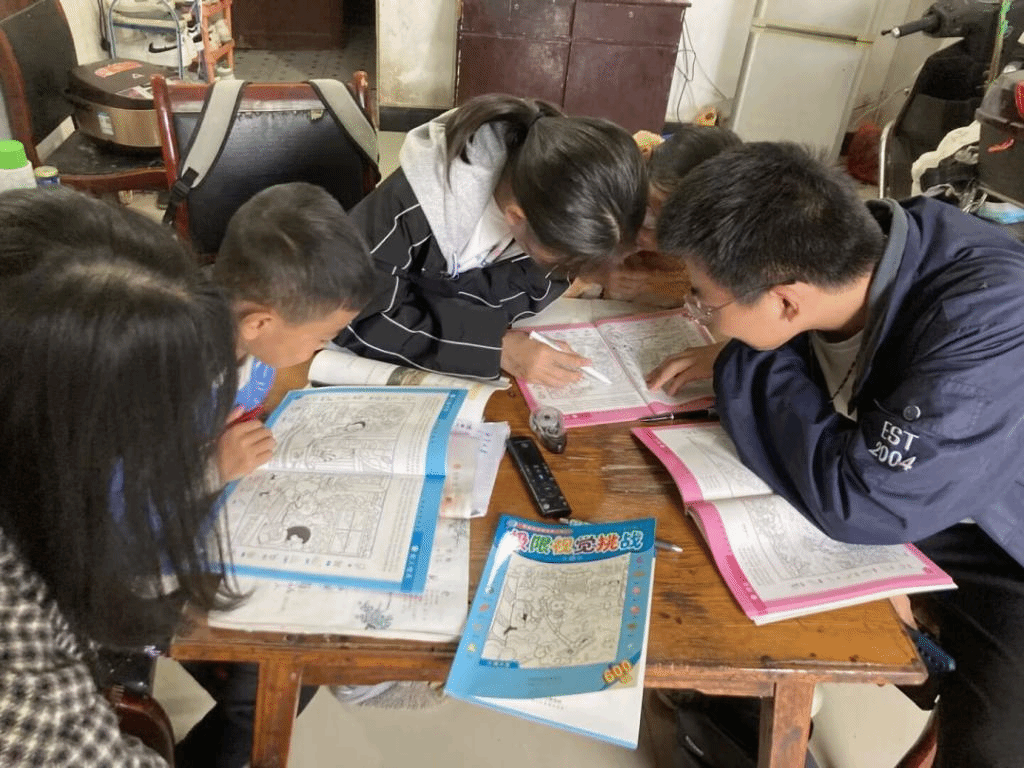 (志愿者辅导小朋友写作业)