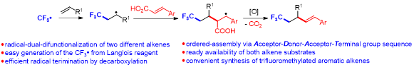 46, Jing Zhao, Ren-Xiang Liu, Cui-Ping Luo and Luo Yang*, “Radical-Dual-Difunctionalization (RDD) and Trifluoromethyla-tive Decarboxylation of Two Different Alkenes.” Org. Lett. 2020, 22, 6776–6779. (2020-0821, heighted by Organic Chemistry Portal: https://www.organic-chemistry.org/abstracts/lit7/510.shtm)