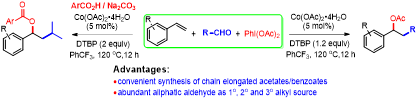 38,Yong Peng, Yuan-Yuan Jiang, Xue-Jiao Du, Da-You Ma, and Luo Yang,* “Co-catalyzed decarbonylative alkylative esterification of styrenes with aliphatic aldehydes and hypervalent iodine(III) reagents.” Org. Chem. Front. 2019, 6, 3065–3070. (2019-0708)