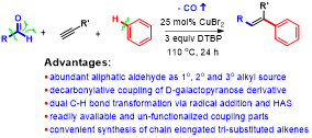 40,Ren-Xiang Liu, Feng Zhang, Yong Peng and Luo Yang*, “Four-component radical-dual-difunctionalization (RDD) and decarbonylative alkylative peroxidation of two different alkenes with aliphatic aldehydes and TBHP”, Chem. Commun. 2019, 12080-12083. (2019-0725)