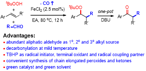 35,Chuan-Shuo Wu, Rong Li, Qi-Qiang Wang and Luo Yang*. “Fe-catalyzed decarbonylative alkylation-peroxidation of alkenes with aliphatic aldehydes and hydroperoxide under mild conditions.” Green Chem. 2019, 21, 269-274. (2018-11-30)