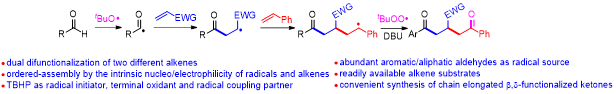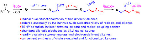 39,Chuan-Shuo Wu, Ren-Xiang Liu, Da-You Ma, Cui-Ping Luo, Luo Yang*, “Four-Component Radical Dual-Difunctionalization (RDD) of Two Different Alkenes with Aldehydes and TBHP: An Easy Access to b,d-Functionalized Ketones”. Org. Lett. 2019, 21, 6117−6121. (2019-0719)
